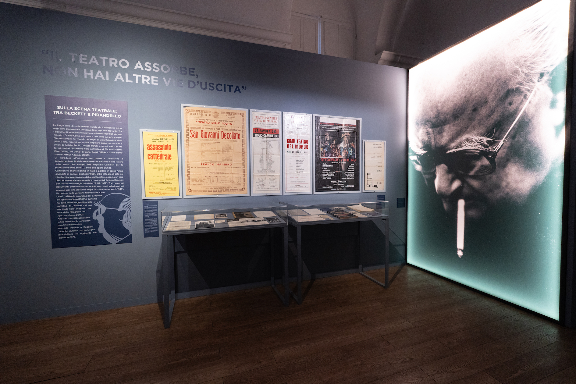Due bacheche esplorano la nascita del Camilleri narratore: dal dattiloscritto Mani avanti (1967–68) a Il corso delle cose (1978), fino all’invenzione poliziesca di Montalbano. Il focus è posto sul personalissimo stile linguistico e narrativo, con lettere editoriali, traduzioni e un glossario siciliano redatto dallo stesso autore.