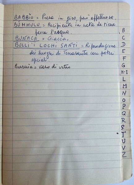 Una pagina del glossario dei termini siciliani redatto da Camilleri intorno agli anni Novanta. Per gentile concessione del Fondo Andrea Camilleri