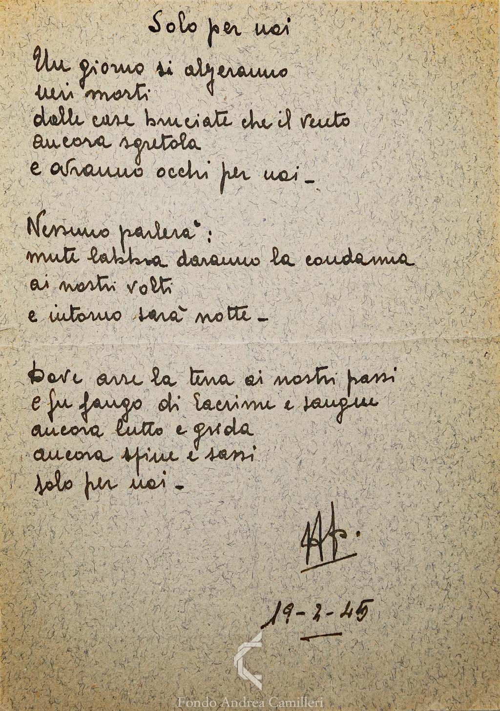 Foglio manoscritto della poesia Solo per noi, composta da Camilleri nel 1945. Per gentile concessione del Fondo Andrea Camilleri