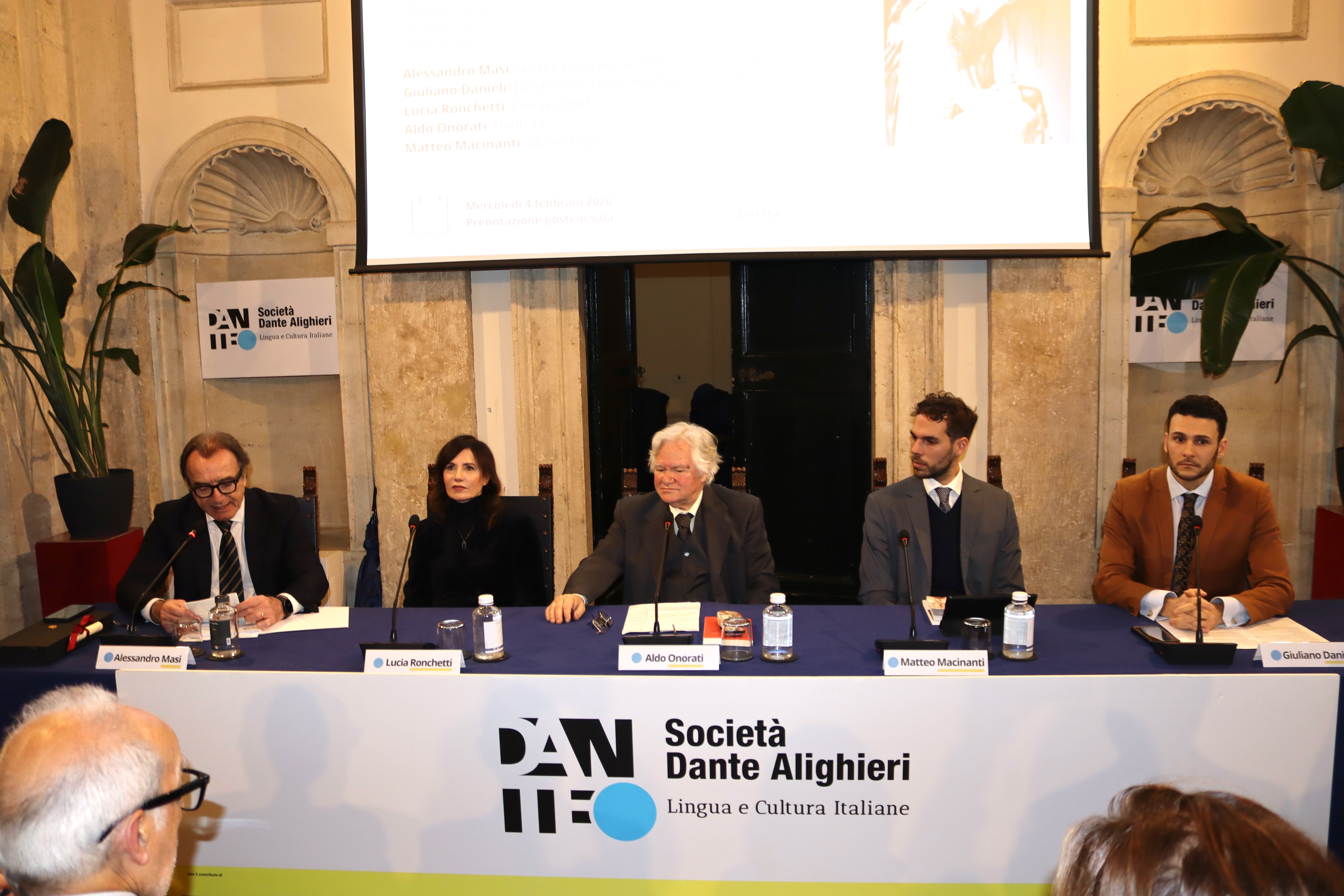 All’incontro intervengono Alessandro Masi, Segretario generale della Società Dante Alighieri, Giuliano Danieli per la Fondazione Teatro dell’Opera di Roma, la compositrice Lucia Ronchetti, il dantista Aldo Onorati e il musicologo Matteo Macinanti, chiamati a riflettere sul rapporto tra poesia, musica e visione, tra tradizione letteraria e scrittura contemporanea.