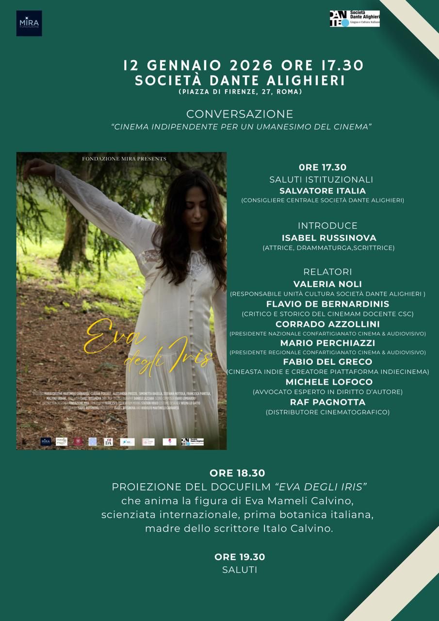 Lunedì 12 gennaio alle ore 17.30, presso Palazzo Firenze (Piazza di Firenze 27, Roma), la Società Dante Alighieri e la Fondazione MIRA promuovono la conversazione “Cinema indipendente per un umanesimo del cinema”, dedicata al ruolo culturale, civile e creativo del cinema indipendente.