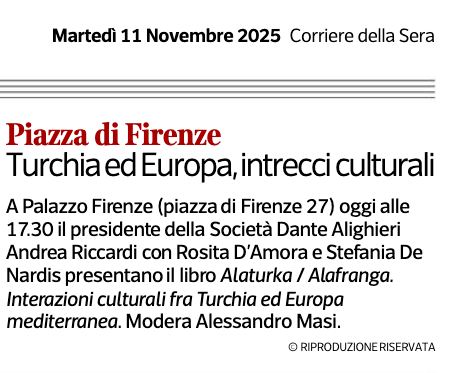 A Palazzo Firenze (Roma) martedì 11 novembre la raccolta di saggi "Alaturka / Alafranga" in un dialogo su viaggi, lingue, arti, identità e influenze culturali fra Turchia ed Europa mediterranea.