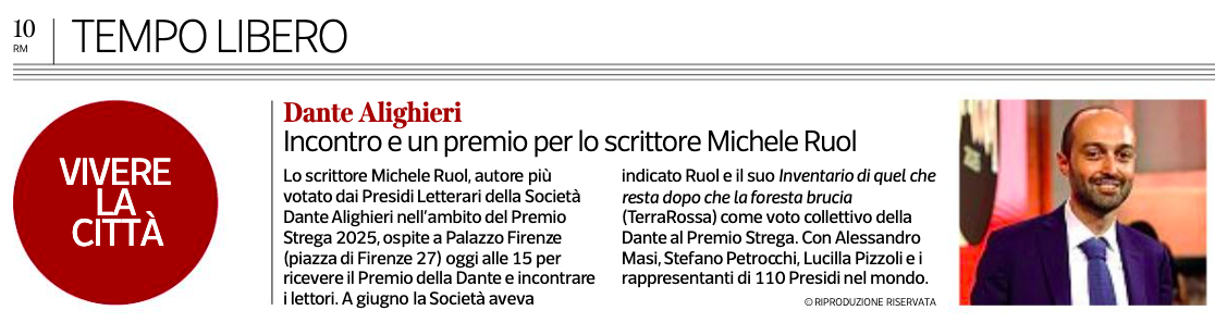 A Michele Ruol il voto della Dante per il Premio Strega 2025. Ecco la terna dei più apprezzati