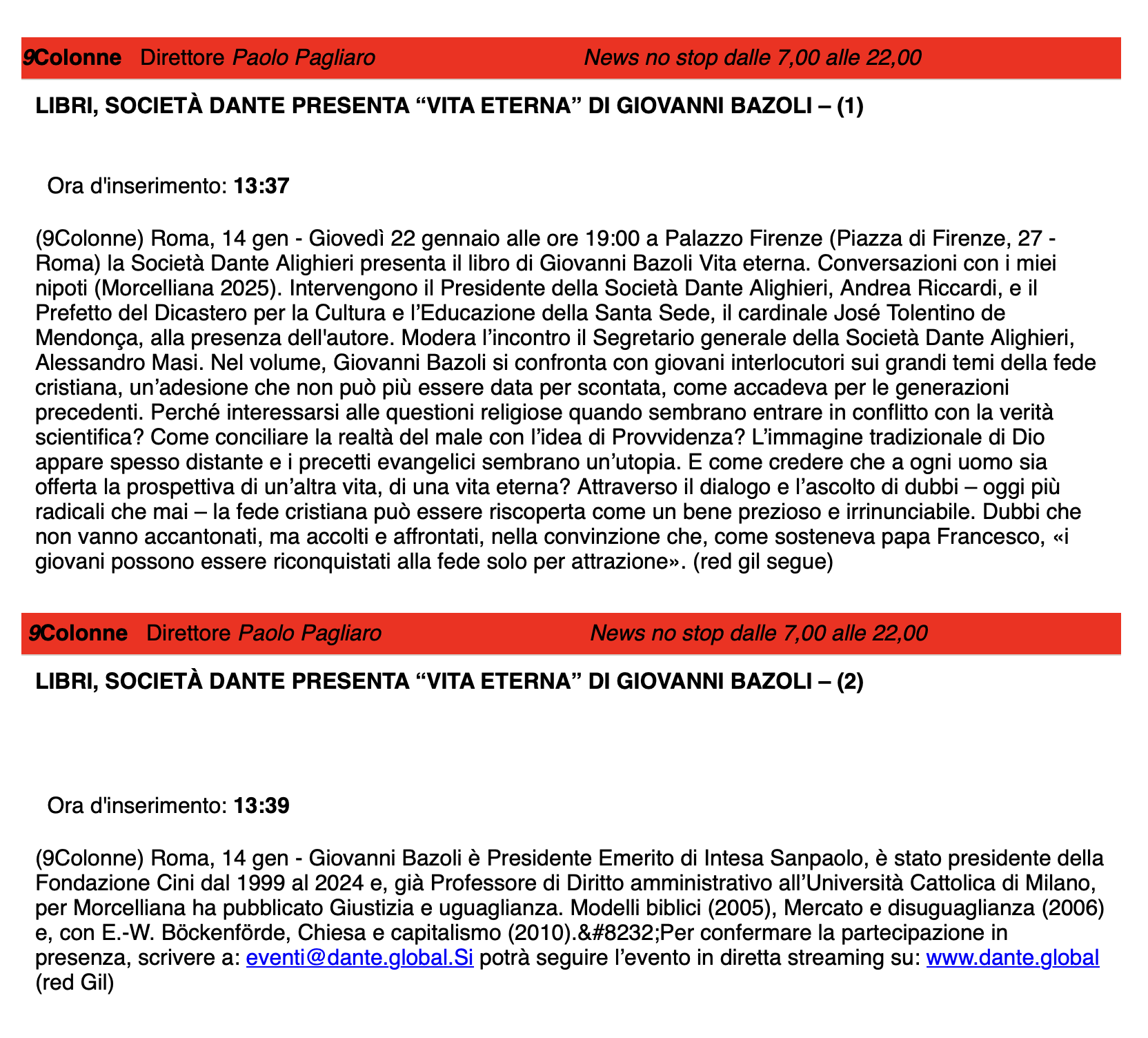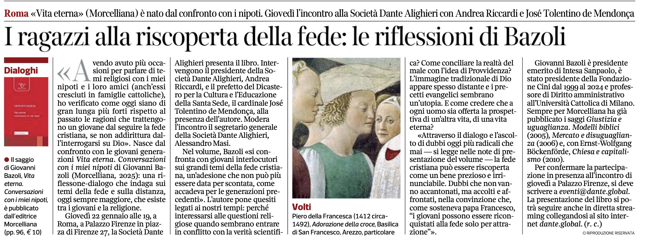 La Società Dante Alighieri presenta il 22 gennaio l’ultimo libro di Giovanni Bazoli