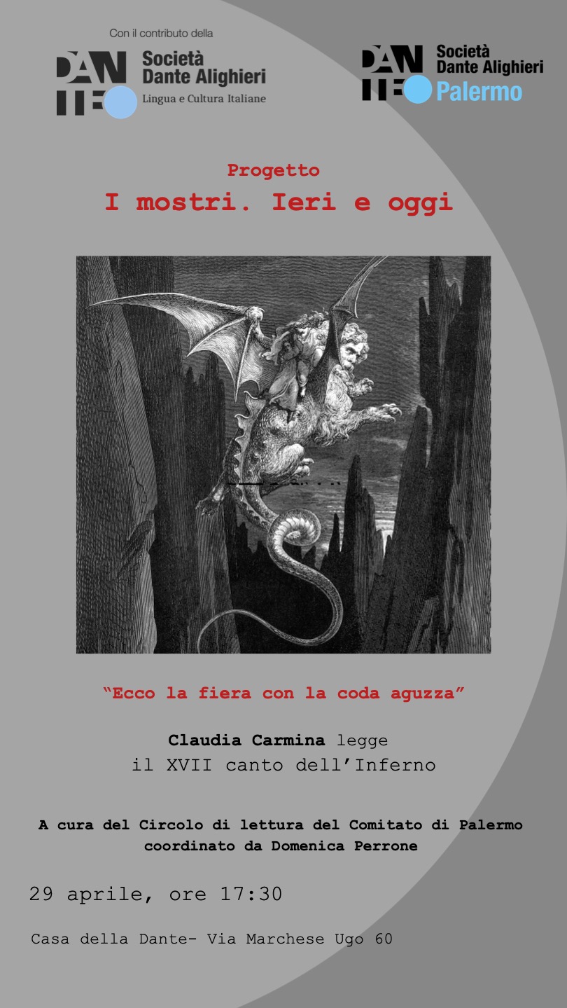 Prende il via, giorno 29 aprile, alle ore 17:30, nella sede della Società Dante Alighieri-Comitato di Palermo, il progetto "I mostri. Ieri e oggi", realizzato con il contributo della Società Dante Alighieri.